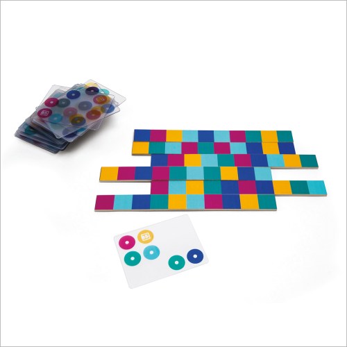 Soyez le premier à réaliser le puzzle avec les bandes colorées en bois pour qu’il corresponde aux couleurs représentées sur la carte. Le premier qui réussit gagne la carte. La partie se termine quand l’un des joueurs gagne 7 cartes.